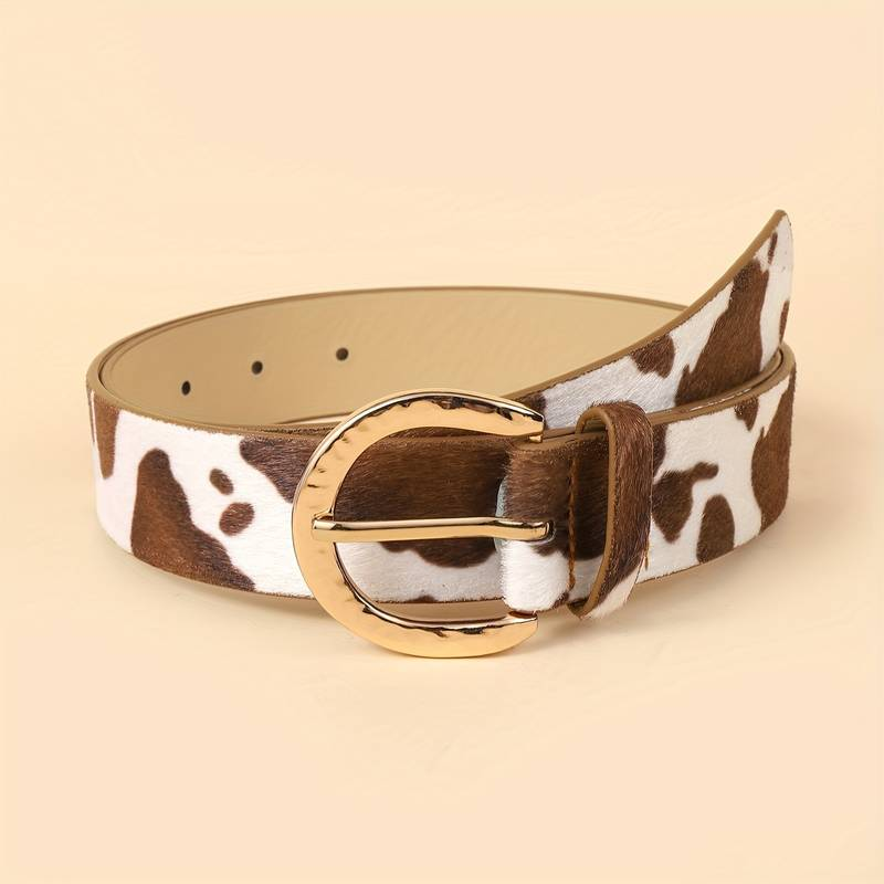 Добави доза див запад в тоалета си с колана Cowgirl Chic! Този модерен аксесоар с животински принт в кафяво-бели тонове и златиста, овална тока е истински акцент за всяка визия. Меката текстура и реалистичният косъм ефект създават усещане за лукс и индивидуалност. Перфектен избор за дънки, пола или рокля, когато искаш да подчертаеш стил с характер.