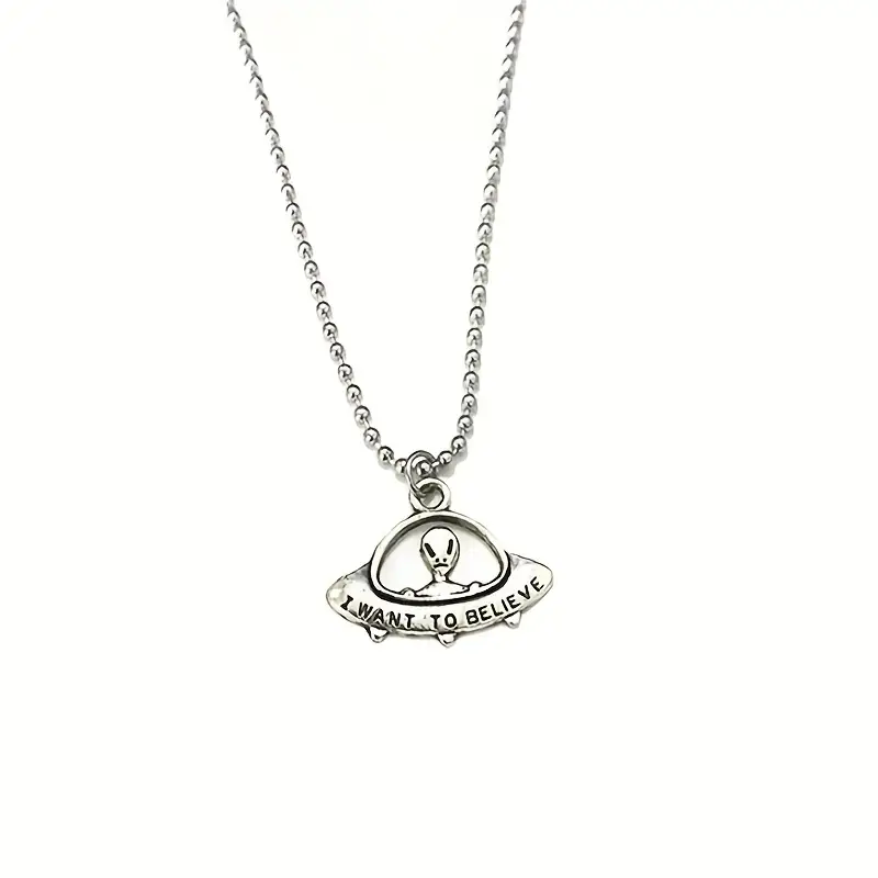 Колие I Want to Believe е перфектният аксесоар за почитателите на мистериозното и извънземното. Сребристият медальон във формата на летяща чиния с извънземно в центъра носи послание за любопитство и вяра в непознатото. Изработено от устойчив метал и комбинирано с верижка от малки топчета, то е едновременно стилно и забавно допълнение към ежедневната визия.