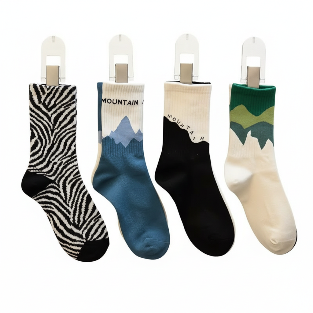 Добави свежест и стил към ежедневната си визия с комплекта “Mountain Vibes” – 4 чифта модерни и удобни чорапи, вдъхновени от природата. Всеки чифт има уникален дизайн – от абстрактни черни шарки до красиво илюстрирани планински пейзажи. Изработени от мека, дишаща материя, те осигуряват комфорт през целия ден, без да запарват и без да се свличат. Подходящи са както за спортни обувки, така и за ежедневно носене. Перфектният избор за хора, които обичат качеството, удобството и нестандартните аксесоари.