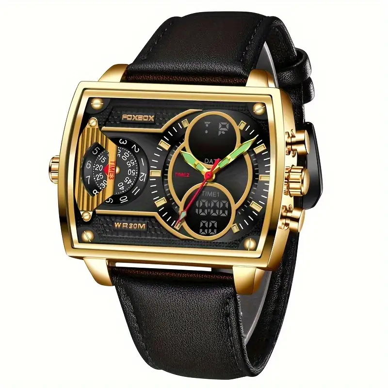 Golden Titan е часовник, създаден за онези, които не просто следят времето – те го владеят. С мощен дизайн, комбиниращ луксозен златен корпус и дълбок черен циферблат, този модел излъчва сила и увереност. Двойният дисплей с аналогово и дигитално време, както и допълнителните функции за дата и хронометър, придават модерна функционалност на класическата визия. Черната кожена каишка осигурява комфорт и изтънченост, а водоустойчивостта до 30 метра прави Golden Titan идеален както за ежедневието, така и за специални поводи.