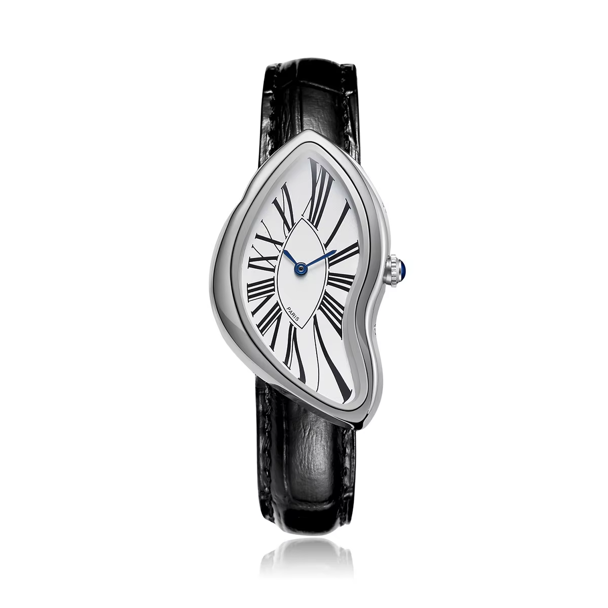 Елегантен и артистичен часовник, вдъхновен от сюрреализма и идеята за течащото време. Извитият му циферблат с римски цифри създава илюзия за движение и оригиналност, превръщайки го в истинско произведение на изкуството. Контрастът между черната каишка и сребристия корпус придава изтънченост и стил, подходящ както за ежедневието, така и за специални поводи. Перфектен избор за хора с въображение и усет към уникалното.